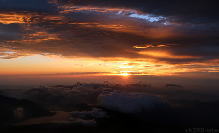 写真3:富士山の山頂で見たドラマチックな朝日。この景色も薄い空気の中で起きている。(撮影:2018/9/6)