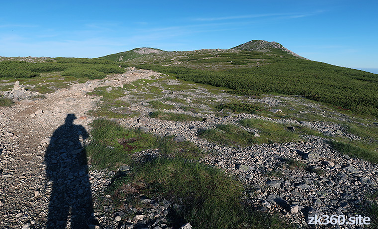 しもさん3写真3:北アルプス・双六岳(すごろくだけ)の双六台地にて。ここで振り向くと、槍ヶ岳がドーンと真正面に見えます。(撮影:2019/8/6)