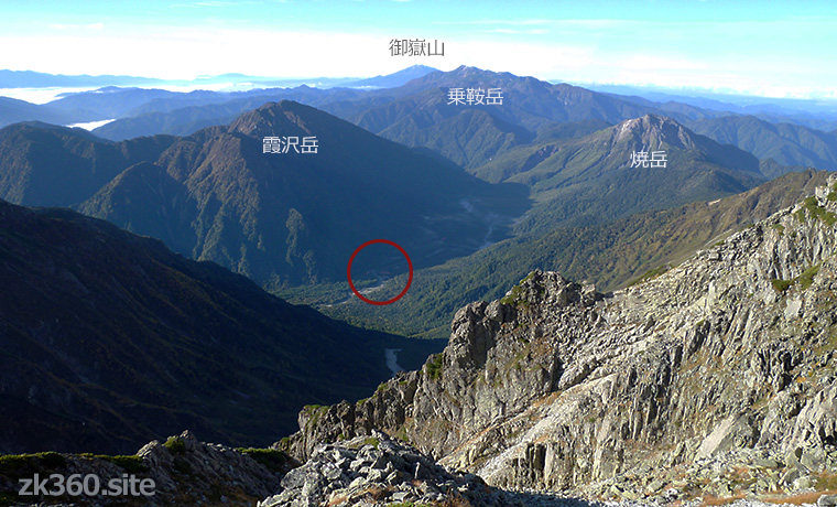 写真5:赤丸の場所が河童橋。梓川は手前から奥へと向かい、霞沢岳(かすみざわだけ)を回り込むように流れていく。(撮影:2016/9/30)