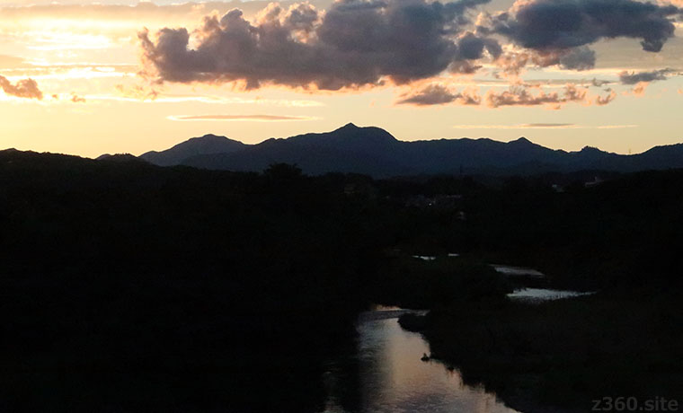 写真2:東京・八王子市内から見た夕方の大岳山(中央のピーク)。左側の少し低く見える山は御前山。手前の川は多摩川ではなく浅川。(撮影:2021/8/10)