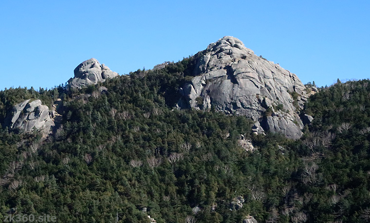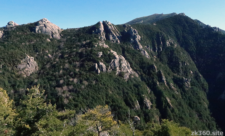 写真2:大日岩(左)から金峰山の山頂(右)まで続く稜線を一望する。登山道は、大日岩の下の谷筋を登って岩の右下に出る。(撮影:2021/11/11)