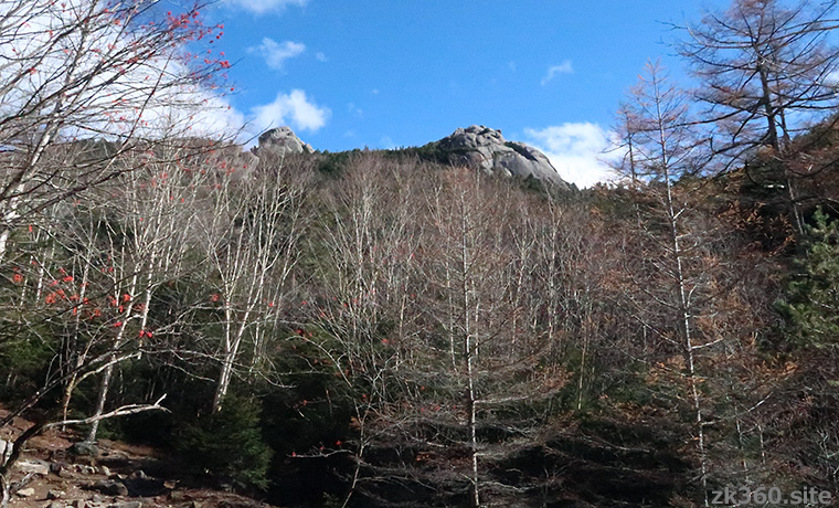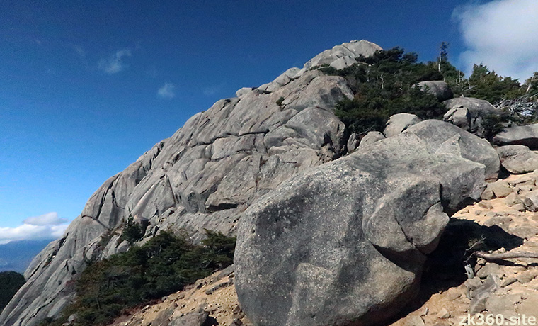 写真3:大日小屋の前から見上げた大日岩。ここから岩の右下まで急登が続く。金峰山登山の難所のひとつ、ガンバリどころだ(撮影:2021/11/10)