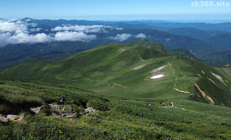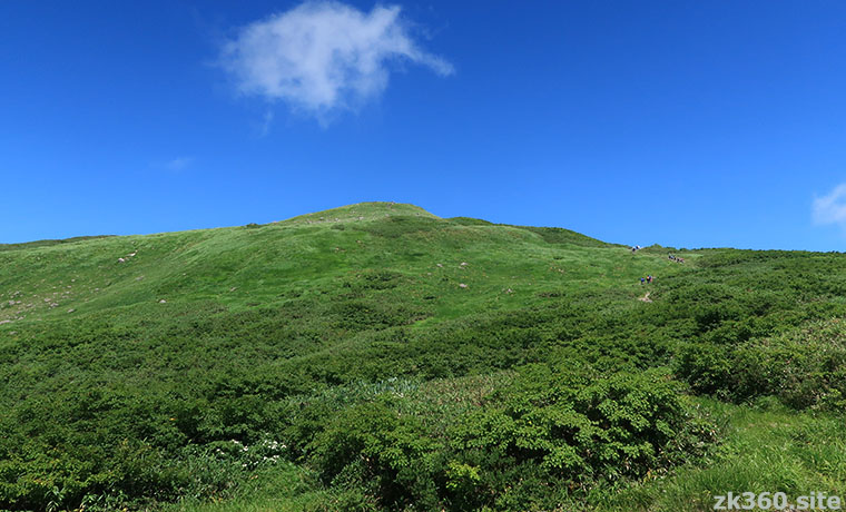 しかし、展望の良さは抜群です。山頂から日本海が見えて、振り返ると月山があります。しかも、その山頂まで、月山スキー場のリフト(登山シーズンも運行)の上駅から約30分で登ることができます。