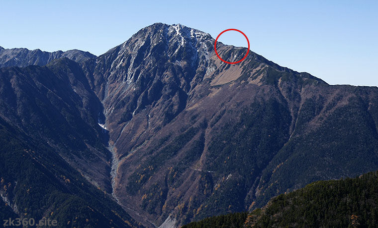 写真1:鳳凰三山から見た北岳。赤丸の部分が北岳ノ肩で、ここは日本有数の絶景スポットのひとつだと思います。(撮影:2003/10/24)