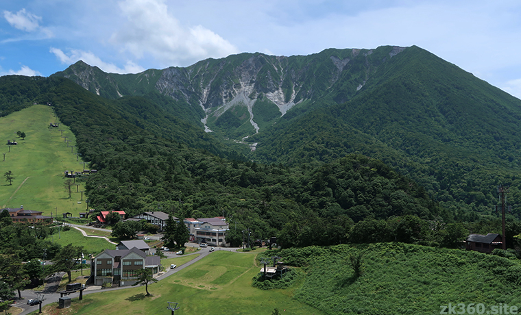 写真4:江府町美用から見た大山の南壁。こちらは火口の外側になる。最高点の剣ヶ峰がよく分かる。登頂可能な弥山は左側にある。(撮影:2022/6/28)