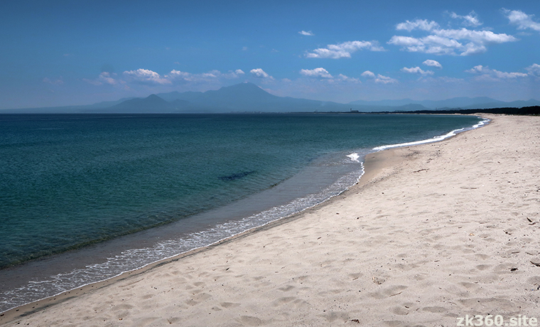写真6:弓ヶ浜にある美保湾展望駐車場「大山遥拝所」から海岸へ降りて遠望した大山。山の印象が、また異なって見える。(撮影:2022/6/30)
