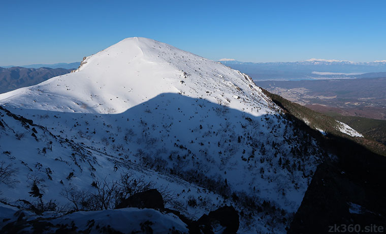 天狗岳タイトル写真2写真2:東天狗の中腹から見た西天狗。このアングルだと穏やかに見えるが左側は急斜面。後方に御嶽山と北アルプスが見える。(撮影:2020/3/25)