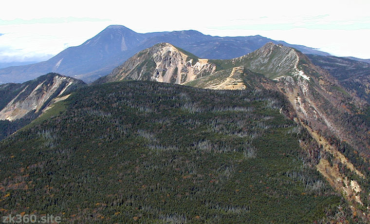 天狗岳タイトル写真4写真4:南側の硫黄岳から見た天狗岳。ほぼ中央の薄茶色が西天狗、その右に東天狗、後方は北八ツの山々で、左の奥が蓼科山。(撮影:2000/10/14)
