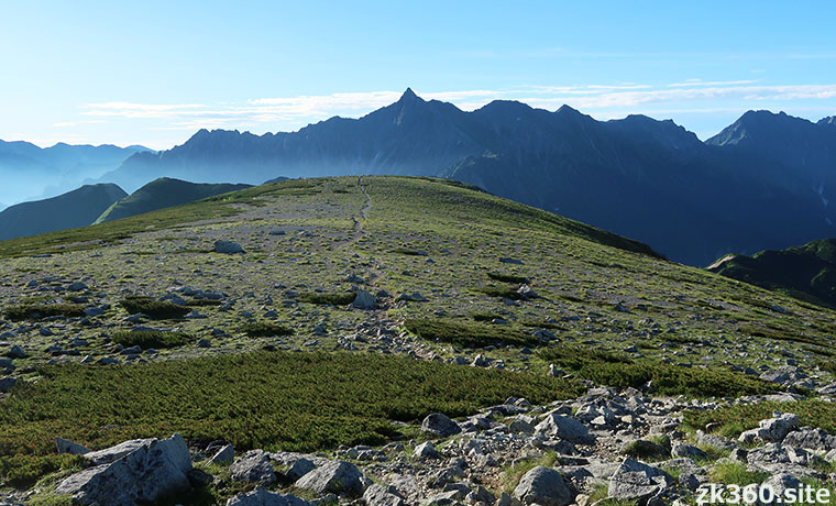 ⑤新穂高温泉から入山して、槍平小屋から南岳に上がるルートもある。南岳からは、槍ヶ岳を目指して3000m級の稜線を縦走する気持ちいいコース。