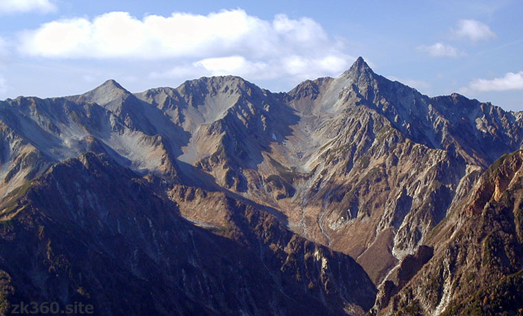 この写真の、左側の最も高いところが奥穂高岳です。その右の小さめの三角形が涸沢岳で、その隣の右に傾いたように見えるのが北穂高岳。そして、中央の大きく下がっているところが大キレットです。
