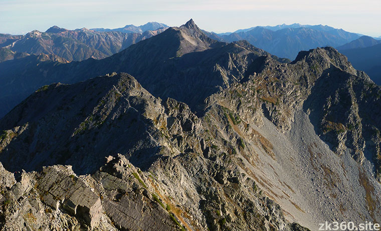 大キレットから右に、南岳、中岳、大喰岳(おおばみだけ)と続くのですが、この距離だと分かりにくいですね。そして、右端にピンと立っているのが槍ヶ岳です。