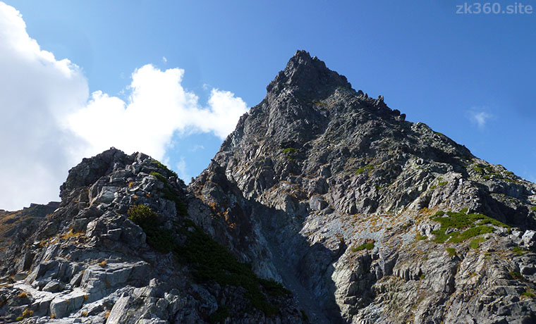 槍ヶ岳タイトル写真5写真5:東鎌尾根から槍の穂先を見上げる。最後は鎖や梯子を頼りに、この左側の急斜面を登って山頂に至る。(撮影:2017/9/26)