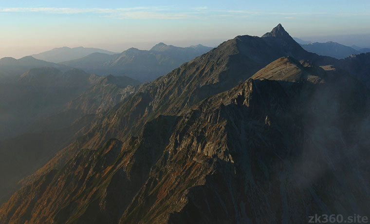 槍ヶ岳山頂から見る朝日が当たる黒部源流域の絶景(撮影:2017/9/27)