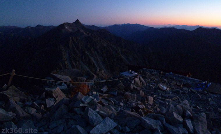槍ヶ岳タイトル写真7写真7:北穂高岳の山頂から見た、夜明け前の槍ヶ岳。ほの暗いなかに、鋭い槍の穂先が浮かび上がってくる。(撮影:2017/9/29)
