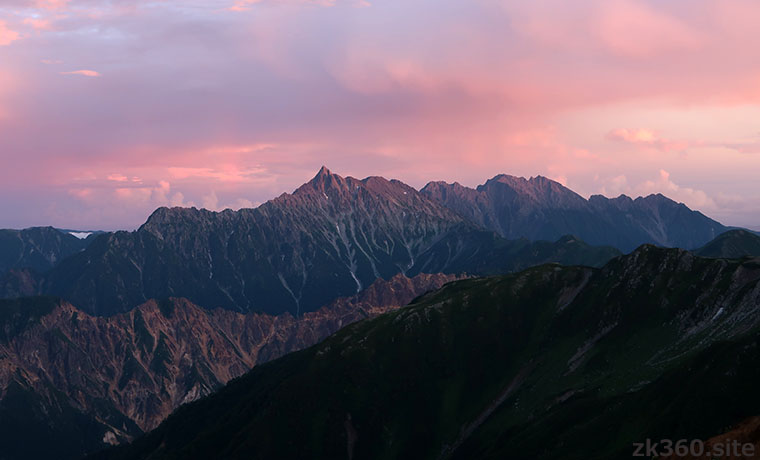 槍ヶ岳タイトル写真8写真8:水晶小屋の近くで見た朝焼けに染まる槍・穂高連峰。これほどの絶景に出会うことは、なかなかない。(撮影:2019/8/7)