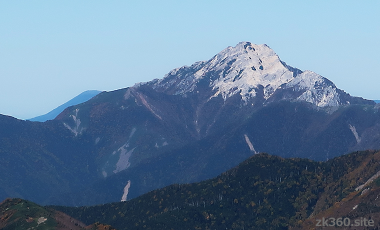 写真5:塩見岳から見た甲斐駒ヶ岳。雪のように白く見えるのは花崗岩。頂上付近はザレ場が続き、歩きにくい。(撮影:2019/10/9)