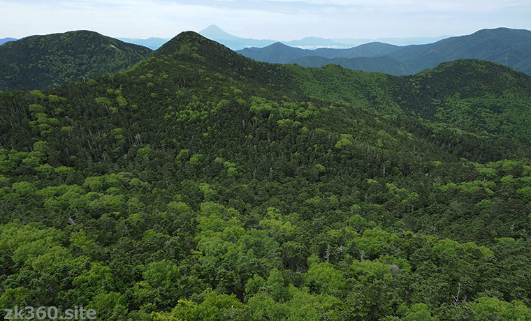 写真2:三宝山の三宝石から見た甲武信ヶ岳。奥に富士山が重なって見える。手前に広がる樹林帯に降った雨は千曲川の源流に流れ込む。(撮影:2023/7/3)
