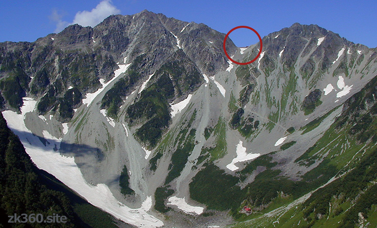写真1:屏風の耳から涸沢越しに見る奥穂高岳(左)と涸沢岳(右)。その間(赤丸の場所)が白出のコル。(撮影:2000/8/22)
