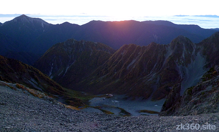 写真3:日の出直前の涸沢。涸沢から見上げる景色もいいけど、白出のコルから見下ろす景色はさらにいい。(撮影:2016/9/30)