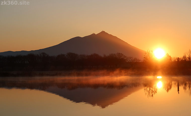 母子島遊水地から望む逆さ筑波山と朝日(撮影:2020/1/20)