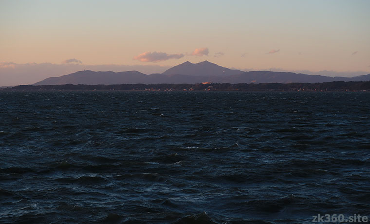 写真4:霞ヶ浦ごしに夕方の筑波山を望む。ここから見ても、独特の双耳峰が目を惹く。左手前に伸びる低い山並みは宝篋山。(撮影:2023/12/7)
