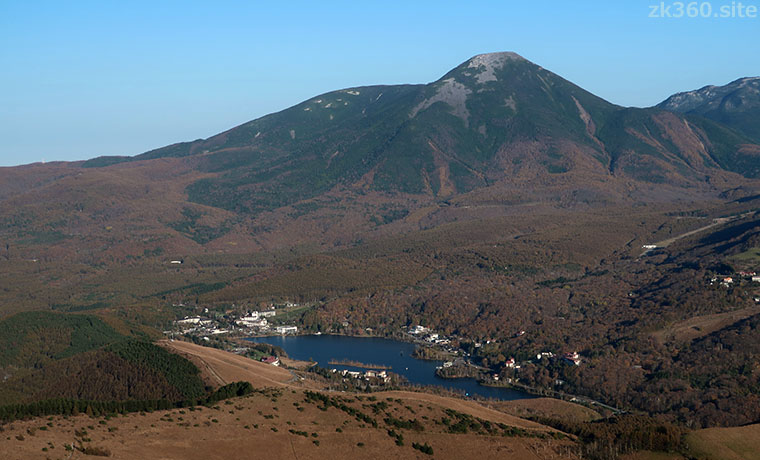 写真2:霧ヶ峰・車山の中腹から見た蓼科山。手前の湖は白樺湖。こうして見ると、あまり個性がない普通の山に見える。(撮影:2017/10/26)