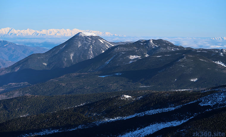 写真3:八ヶ岳の天狗岳から見た蓼科山。右手前は北横岳で、奥の雪山は北アルプス。季節や見る場所で印象が変わる。(撮影:2020/3/25)