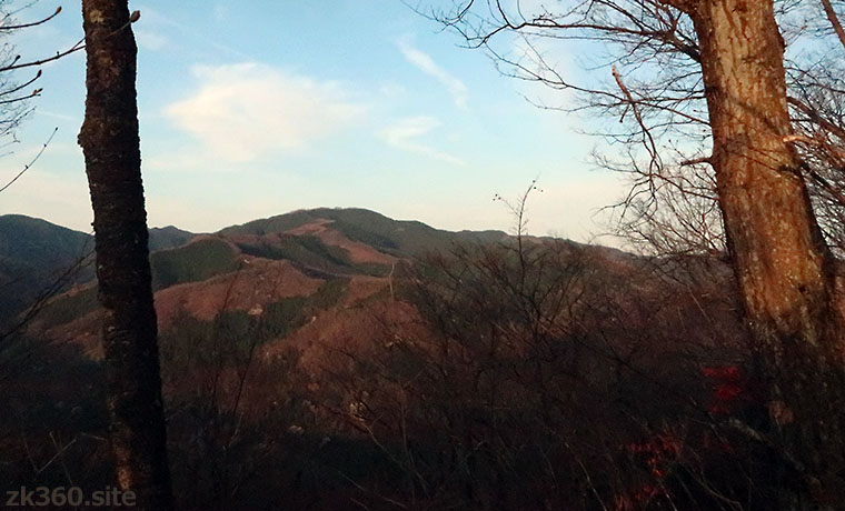 写真3:山梨との県境に近い鷹取山の山頂から見た夕方の陣馬山。西側から見ると、たおやかな丸みを帯びた山容になる。(2021/3/24)