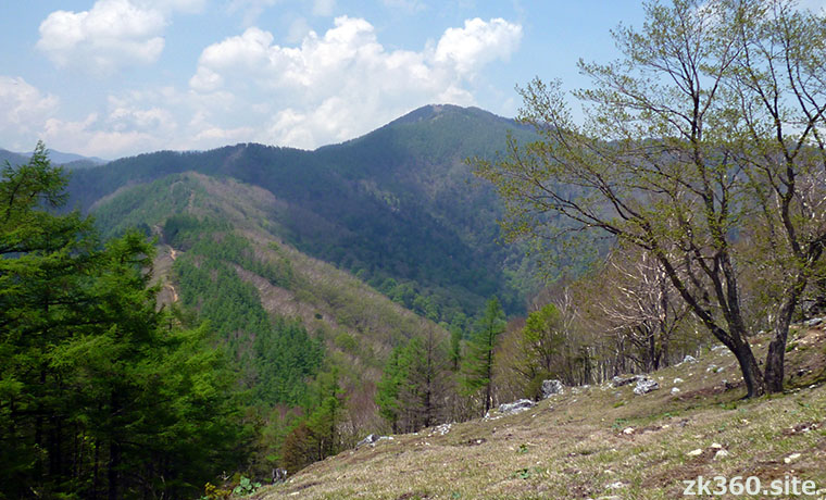 写真1:雲取山の展望台として知られる七ツ石山の山頂から見た5月の雲取山。左側の、登山道のあるところが石尾根。(撮影:2017/5/23)