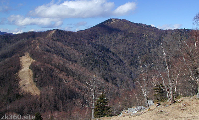 写真2:同じく七ツ石山の山頂から見た12月の雲取山。空気が澄んでいるため、山の形も石尾根も鮮明に見える。(撮影:2001/12/18)